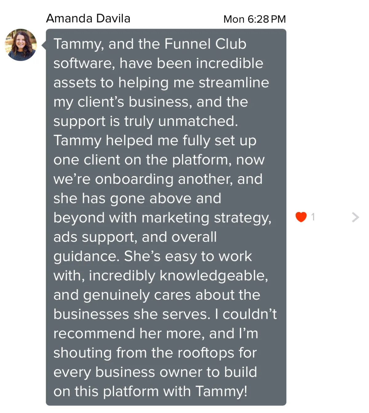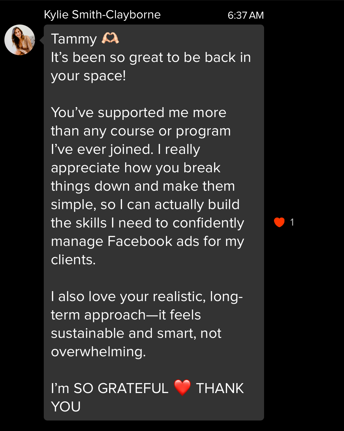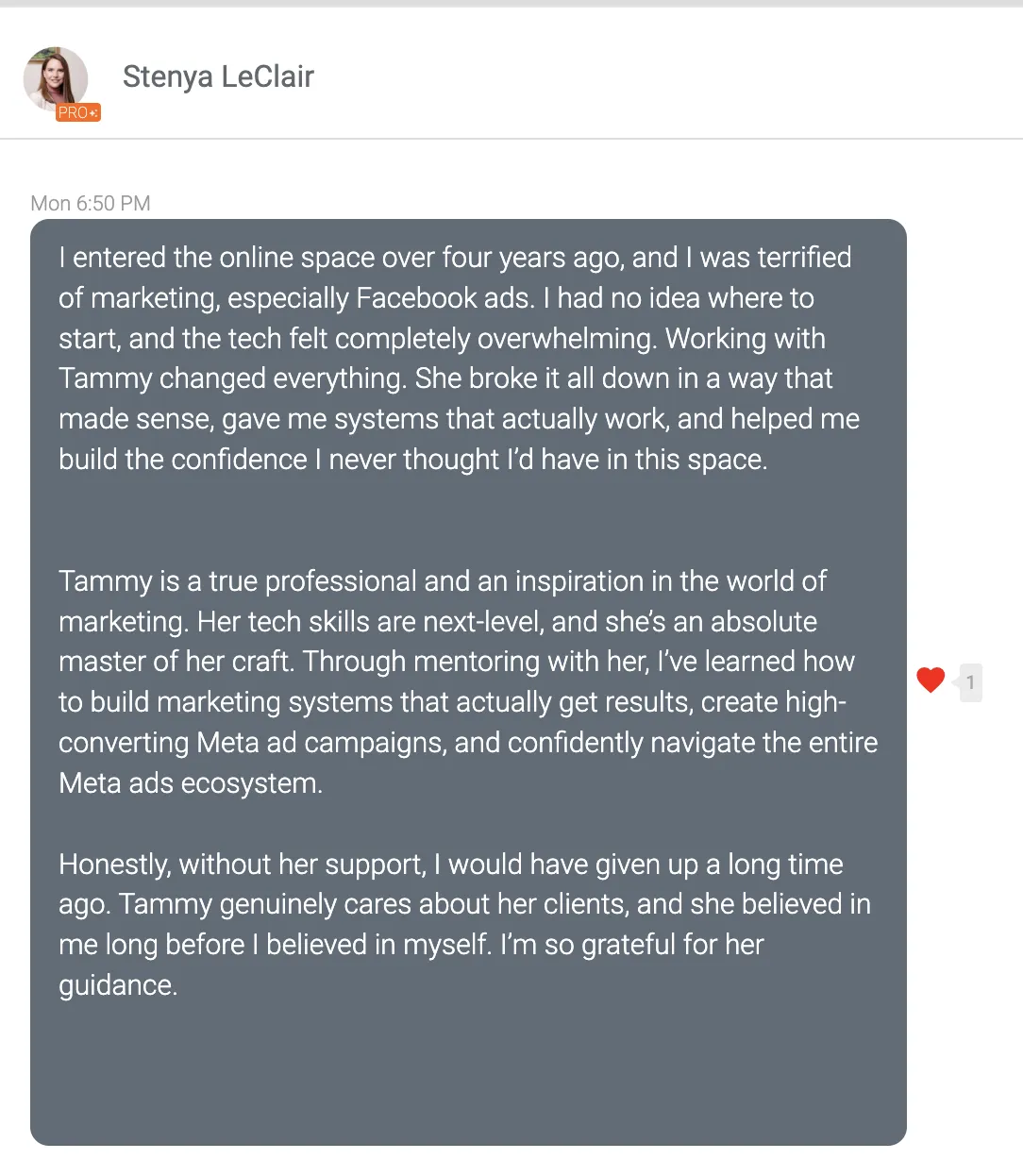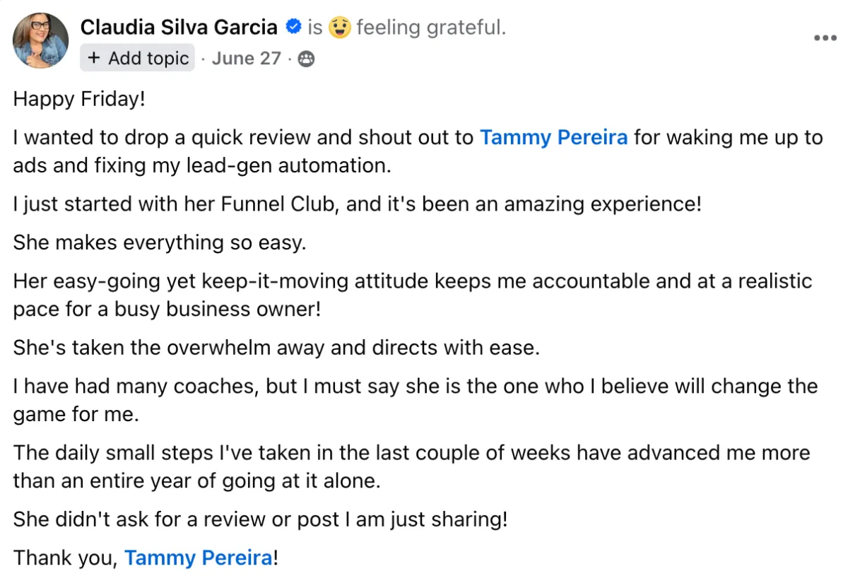 "I ran a masterclass and pulled in 1,000 leads in just three weeks using Tammy's strategy. The targeting, the creative, everything she built with me just worked. I've never had results like this."